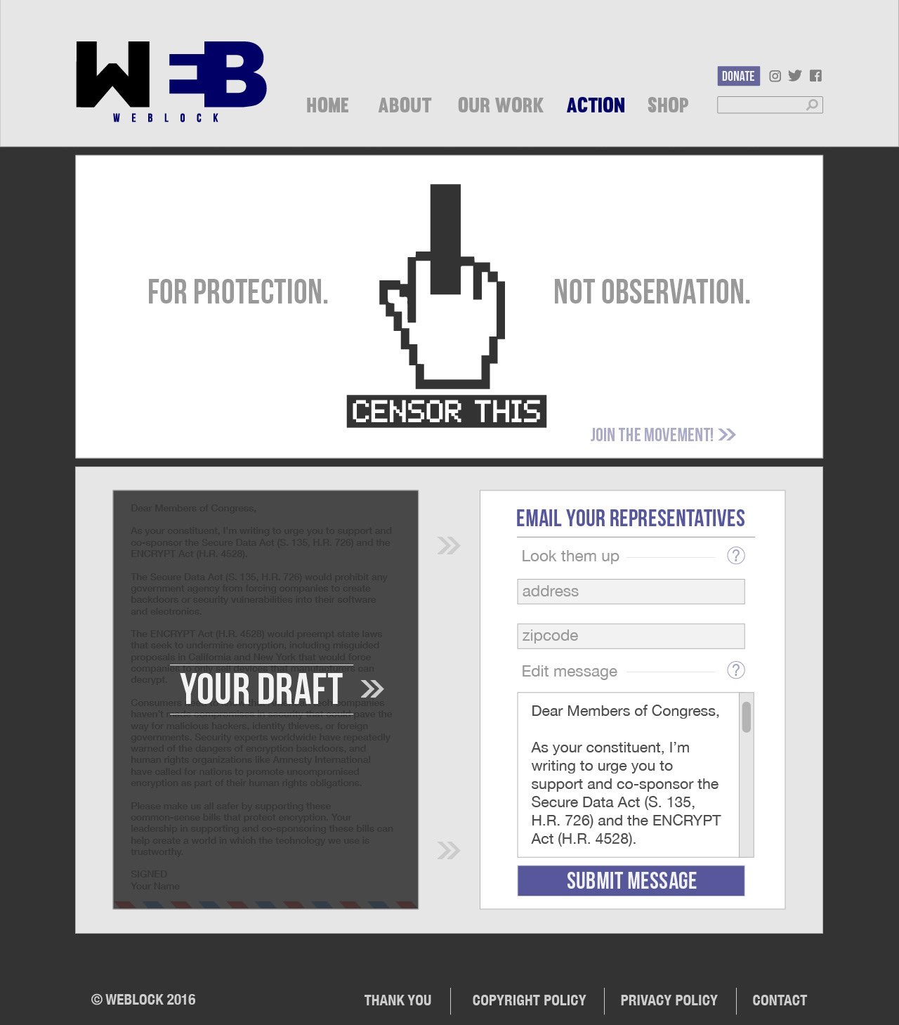 No brand is complete without their own website. This call to action is sure to engage people to take action against internet censorship wether it be from sending a message to their Congressman through the website or spreading their supports with Weblock merchandise.
